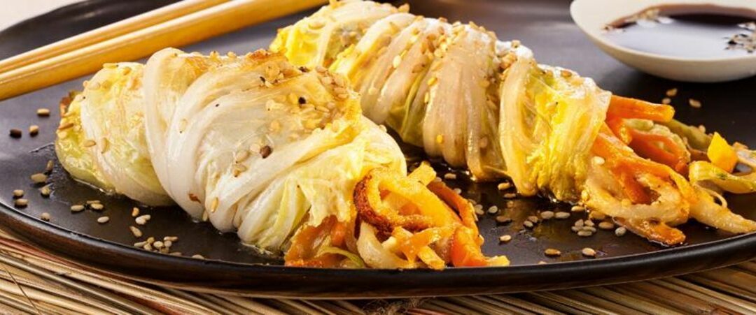 4. Chinakohlblätter auslegen, die Füllung darauf verteilen und zusammenrollen. 2 EL Öl erhitzen und die Frühlingsrollen rundherum anbraten. Mit der Sojasauce servieren. Dazu passt Reis.