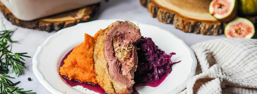 - Gänsebrust nach Ende der Garzeit 10 Minuten in der Folie ruhen lassen. Aufschneiden, mit Rotkohl und Süßkartoffelpüree anrichten.