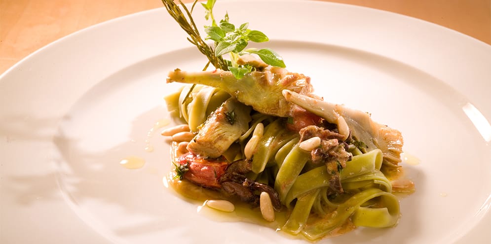 - Tagliatelle bissfest kochen und abgießen, dabei etwas Pastawasser aufbewahren. Tagliatelle in Olivenöl schwenken und warmhalten. Olivenöl erhitzen, Kirschtomaten dazugeben und schwenken, bis sich die Haut löst. Oliven, Parmesan, Butter und so viel Pastawasser zugeben, bis eine cremige Sauce entsteht. Artischocken zugeben und kurz erhitzen.