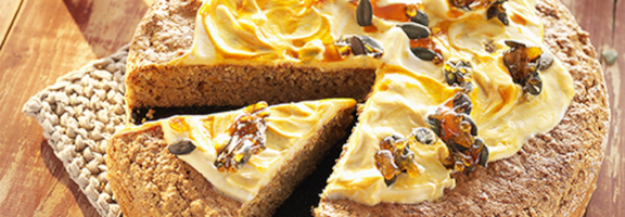 - In der Zwischenzeit Sanddornsaft, Crème fraîche und die andere Hälfte Amaretto zu einer Creme verrühren. 30 g Zucker in einem Topf karamellisieren, Kürbiskerne auf einer gefetteten Fläche verteilen und den Karamell darüber gießen. Abkühlen lassen und grob zerbrechen. Kuchen aus der Form nehmen, abkühlen lassen. Mit der Creme bestreichen und die Kürbiskerne darauf verteilen.
