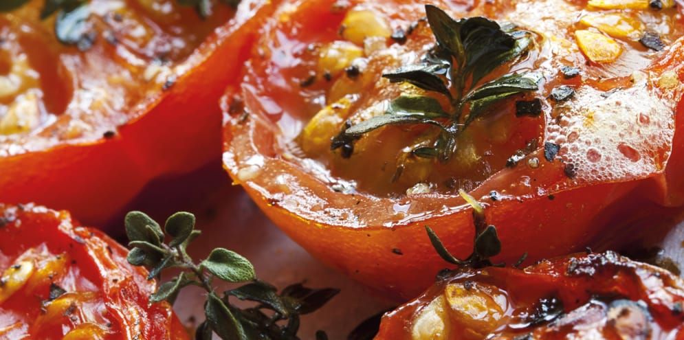 - Die Tomatenviertel mit der Haut nach unten in eine Auflaufform legen und in Olivenöl im Backofen (ca. 150°C) vorgaren, bis sie beginnen, weich zu werden.