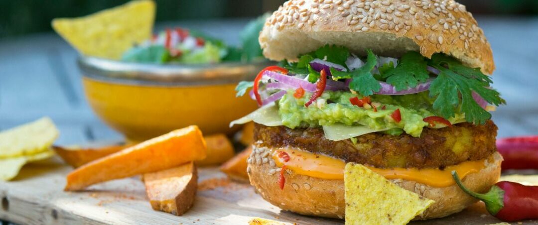 Veggie-Burger mit den Süßkartoffeln, Tortilla-Chips und der übrigen Guacamole servieren und genießen.